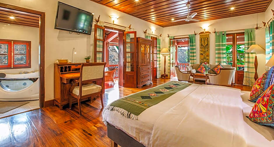 This spacious suite has a sofa seating area. The private bathroom has toilet separate from spa bath and shower. The room features a large L-shaped balcony boasting a side view of the Mekong River.